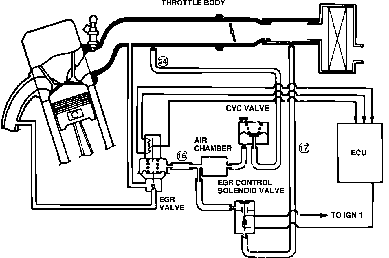 On models with fuel injected engines, the EGR valve is operated by vacuum from the intake manifold. When the EGR control solenoid valve opens, the EGR valve closes since vacuum is relieved into the intake manifold through the EGR control solenoid valve.