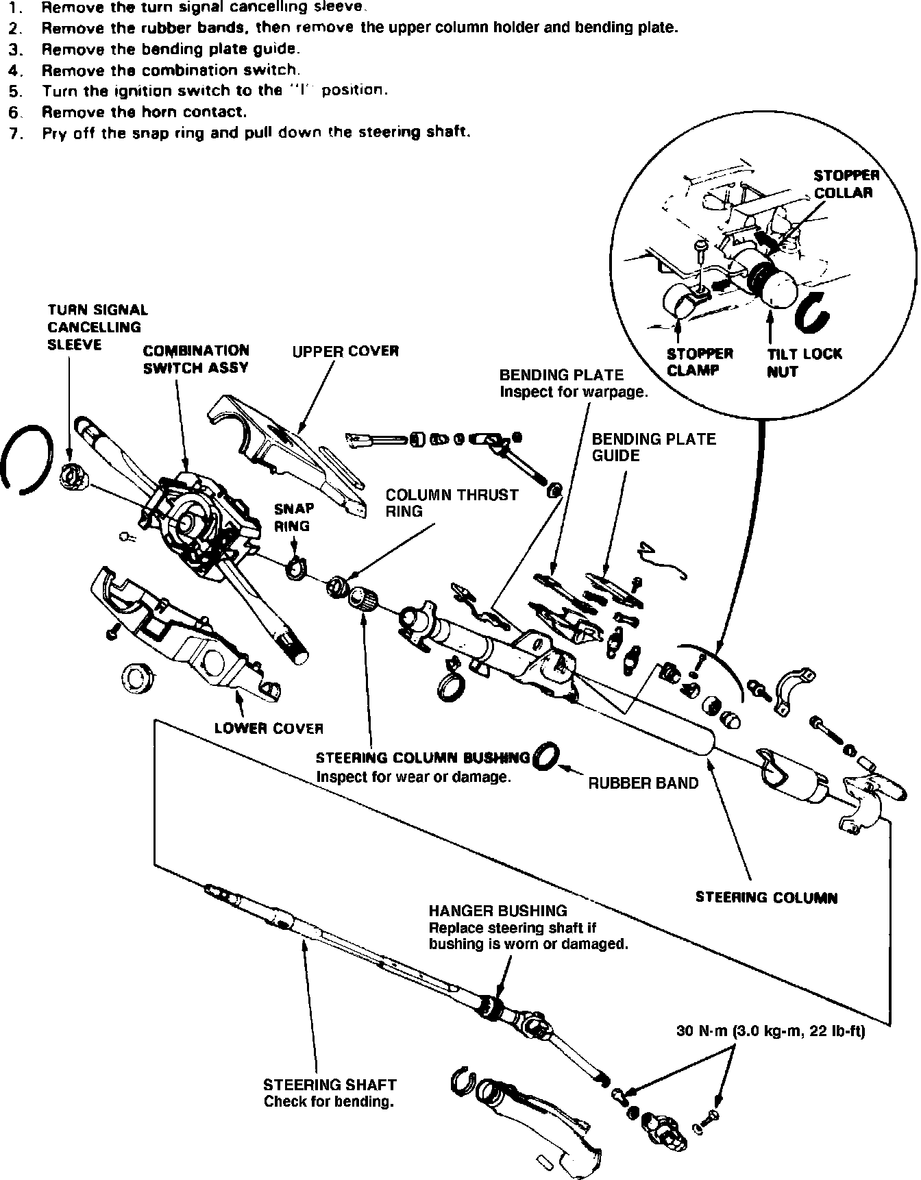 Fig. 5 Tilt steering column exploded view. 1985-87 Civic w/power steering (conventional column similar):