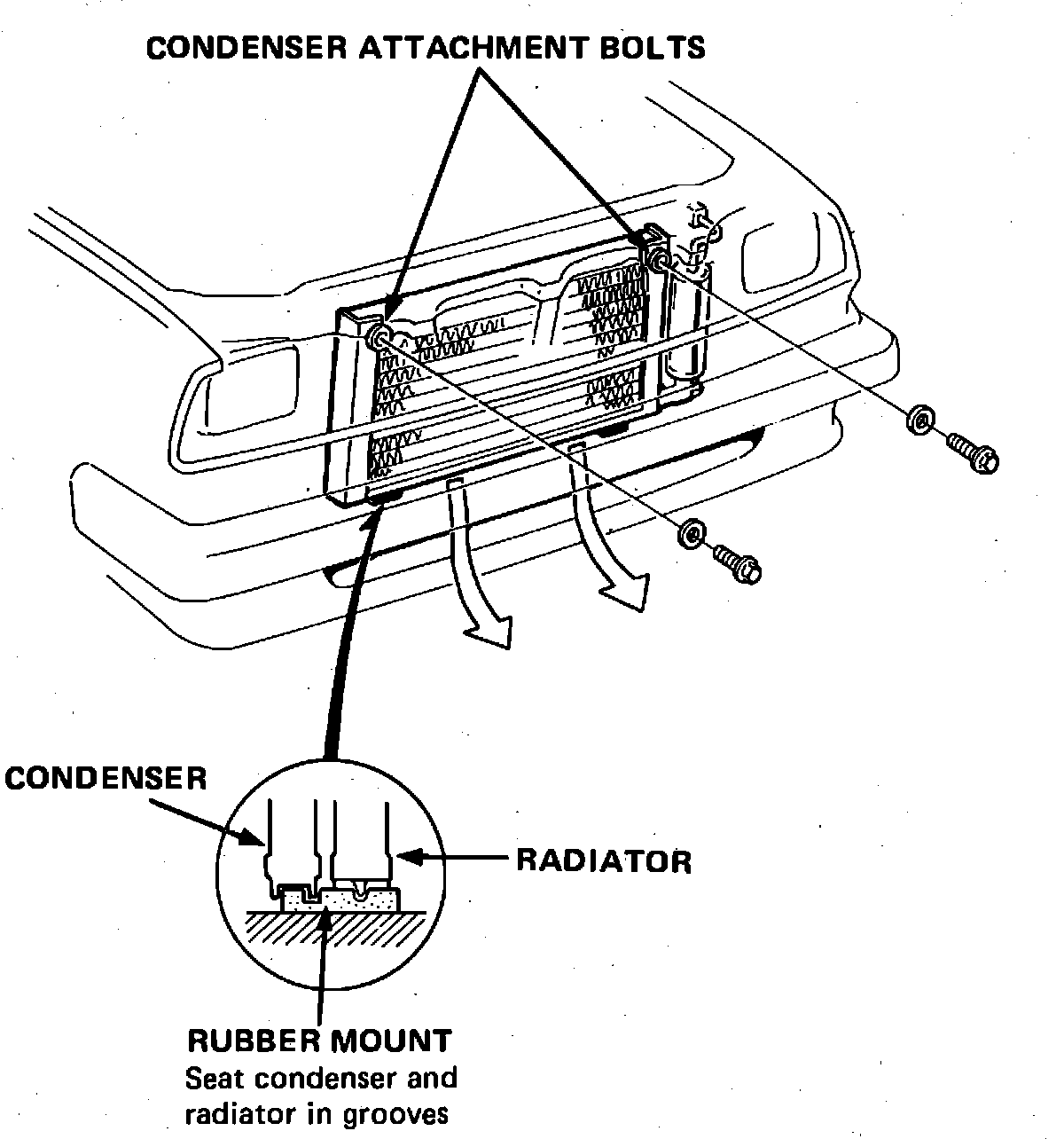 10. Push condenser up and out of grooves in rubber mount blocks, Fig. 9. Carefully pull forward to allow condenser to be removed through air dam.