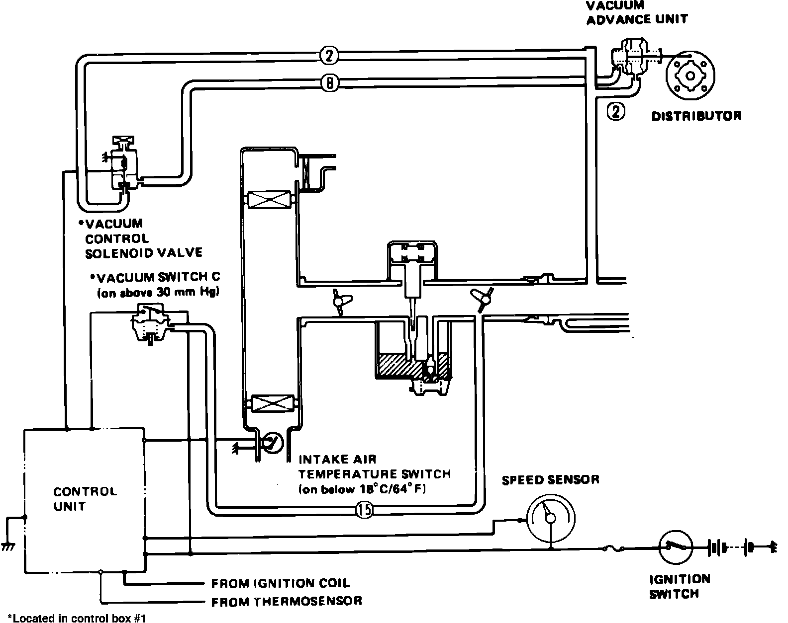 This system, Fig. 41, is designed to improve driveability at cold engine temperature by advancing ignition timing. The vacuum control solenoid valve is operated by the control unit which receives signals from the intake air temperature sensor and thermosensor. When vacuum control solenoid valve opens to introduce manifold vacuum to the vacuum advance unit, the distributor breaker plate is turned and ignition timing advanced.