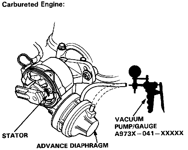 1. Remove the distributor cap and vacuum hoses (# 12, # 15 for Fuel-Injected Engine or # 2, # 25 for Carbureted Engine) from the advance diaphragm.