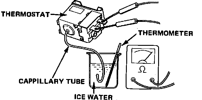 1. Immerse thermostat capillary tube in temperature controlled solution and connect ohmmeter to terminals, Fig. 33.
