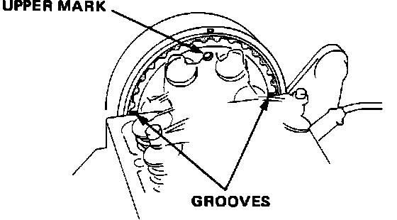 2. Align #1 cylinder to TDC. The "UP" mark on the camshaft pulley should be at the top, and the TDC grooves on the back side of the camshaft pulley should align with the cylinder head surface. The distributor must point to #1 spark plug terminal.