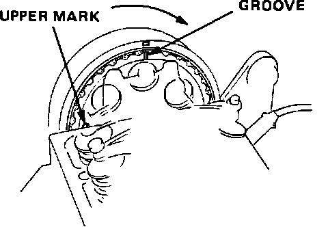 4. Rotate crankshaft 180° counterclockwise. TDC groove on the camshaft pulley should align with the indentation on the belt cover. The "UP" mark should not be visible. Distributor rotor should be pointing to the #3 spark plug terminal.