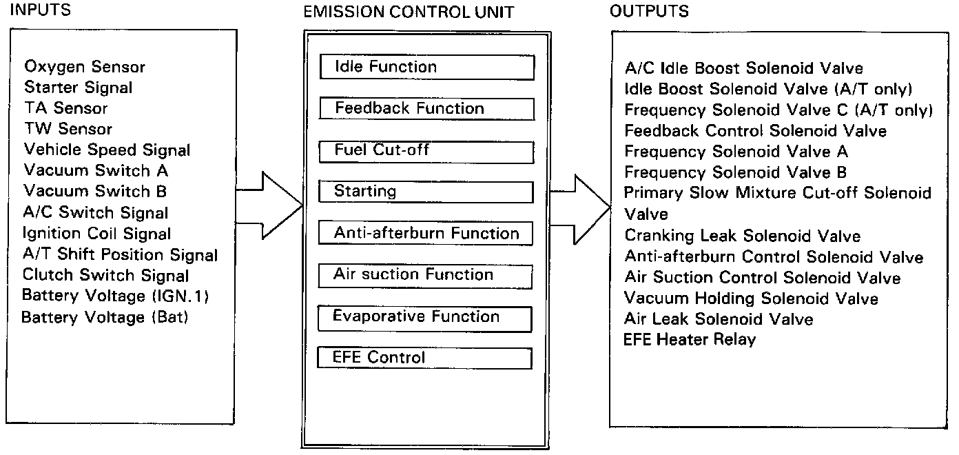 The Emission Control Unit contains logic circuits that sense the inputs and apply outputs as required to control emissions and effect smooth engine performance.