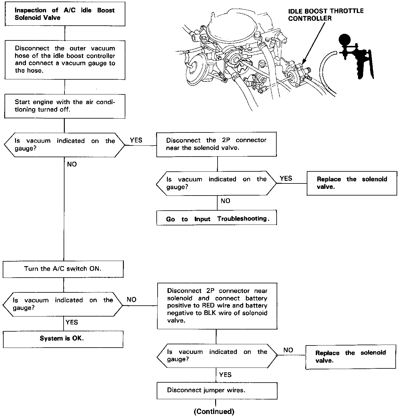 The A/C idle boost solenoid valve is energized when the A/C compressor is energized, applying vacuum to the outer diaphragm of the idle boost throttle controller. This increase the idle speed when the A/C compressor is on. (Note: manual transmission single diaphragm)