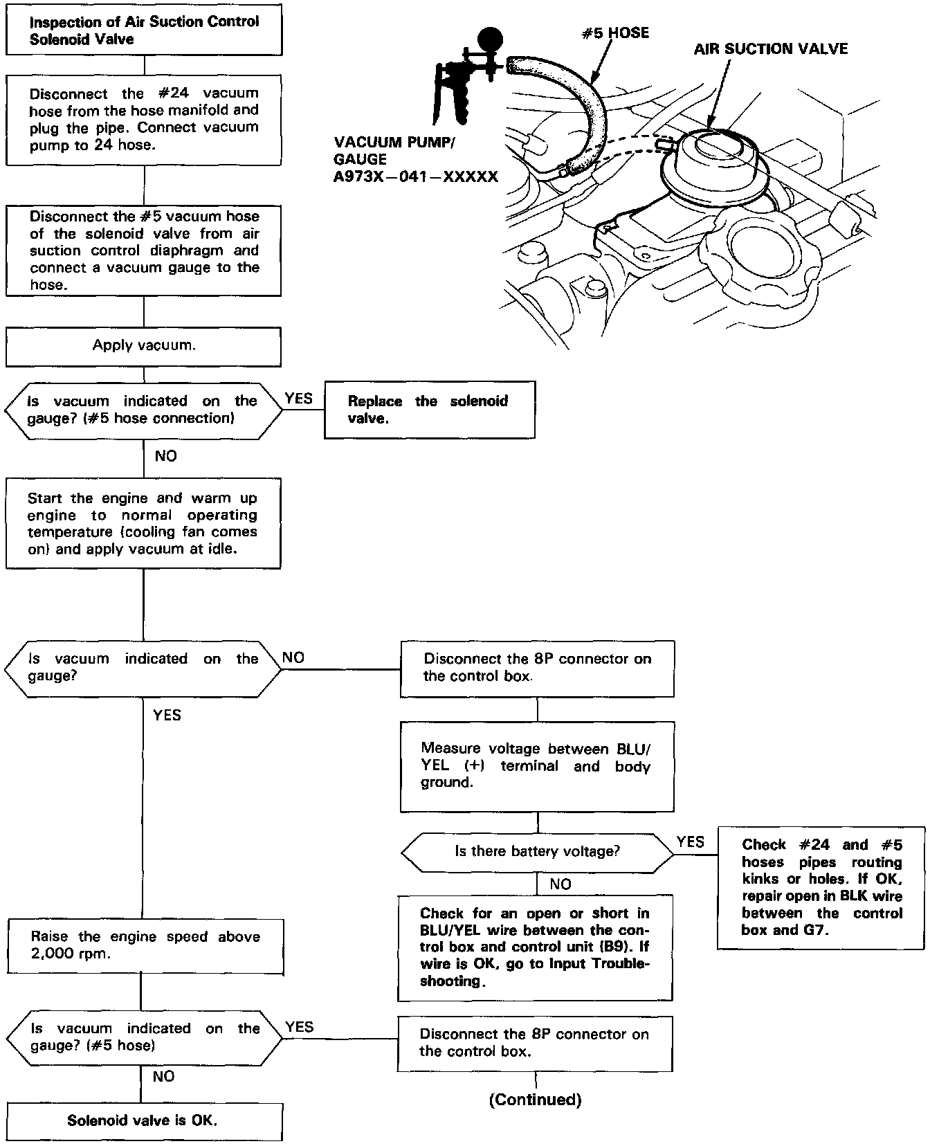 When the air suction control solenoid valve is activated, manifold vacuum raises the diaphragm valve of the air suction valve and fresh air from the air cleaner is induced to the exhaust manifold through the reed valve of the air suction valve by pulsation of the exhaust gas.