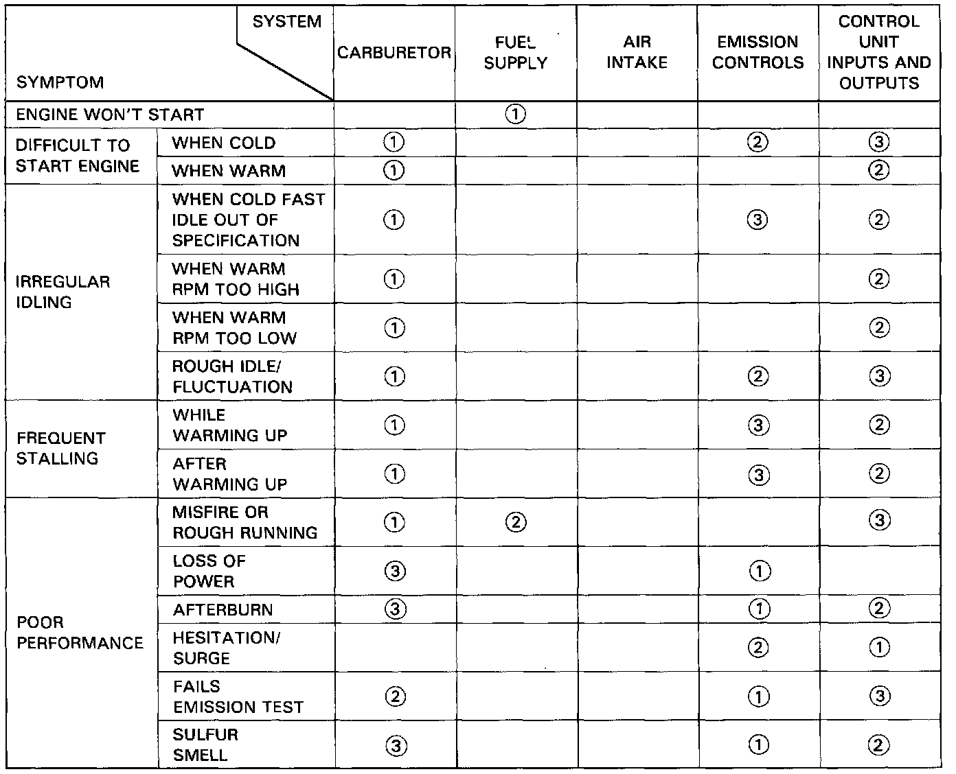 NOTE: Across each row in the chart, the systems that could be sources of a symptom are ranked in the order they should be inspected starting with (1). Find the symptom in the left column, read across to the most likely source, then refer to the system listed at the top of that column. If inspection shows the system is OK, try the next most likely system (2), etc.