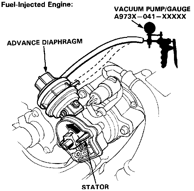 3. When vacuum (more than 500 mmHg, 20 in. Hg) is applied to the diaphragm, the stator should turn counterclockwise and stay. If the stator does not turn or stay, replace the diaphragm.