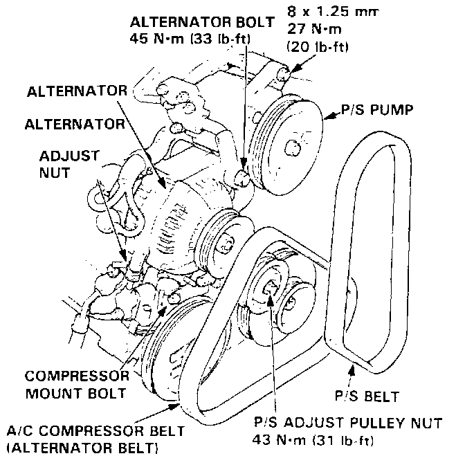 NOTE: On cars with air conditioning (A/C): Remove the A/C compressor mount bolts, then remove the A/C compressor and the belt.