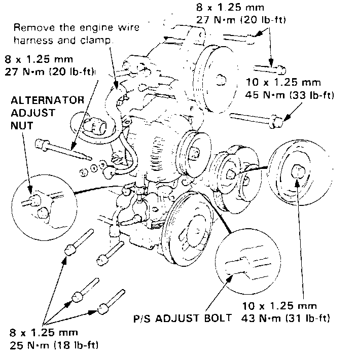 3. Remove the power steering pump adjust pulley nut and the adjust bolt, then remove the adjust pulley, P/S pump and the belt.