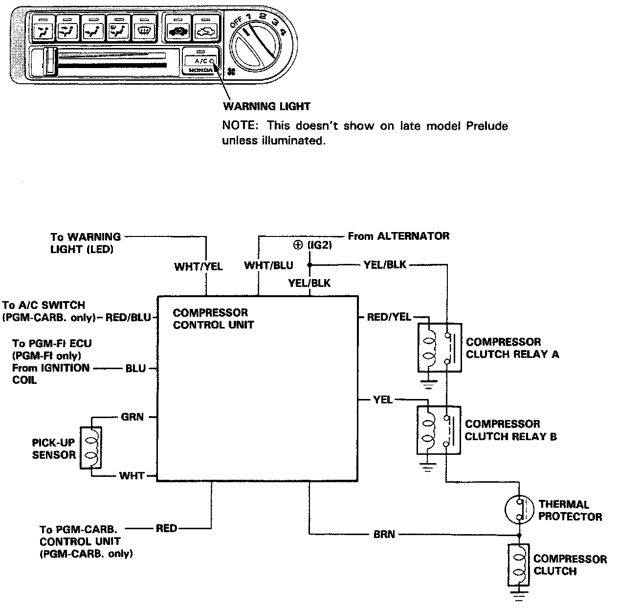 This is done by comparing the engine rpm and the compressor pulley rpm. When there is a difference in rpm that continues for more than 3 seconds, the compressor relays are turned off and the warning light comes on.