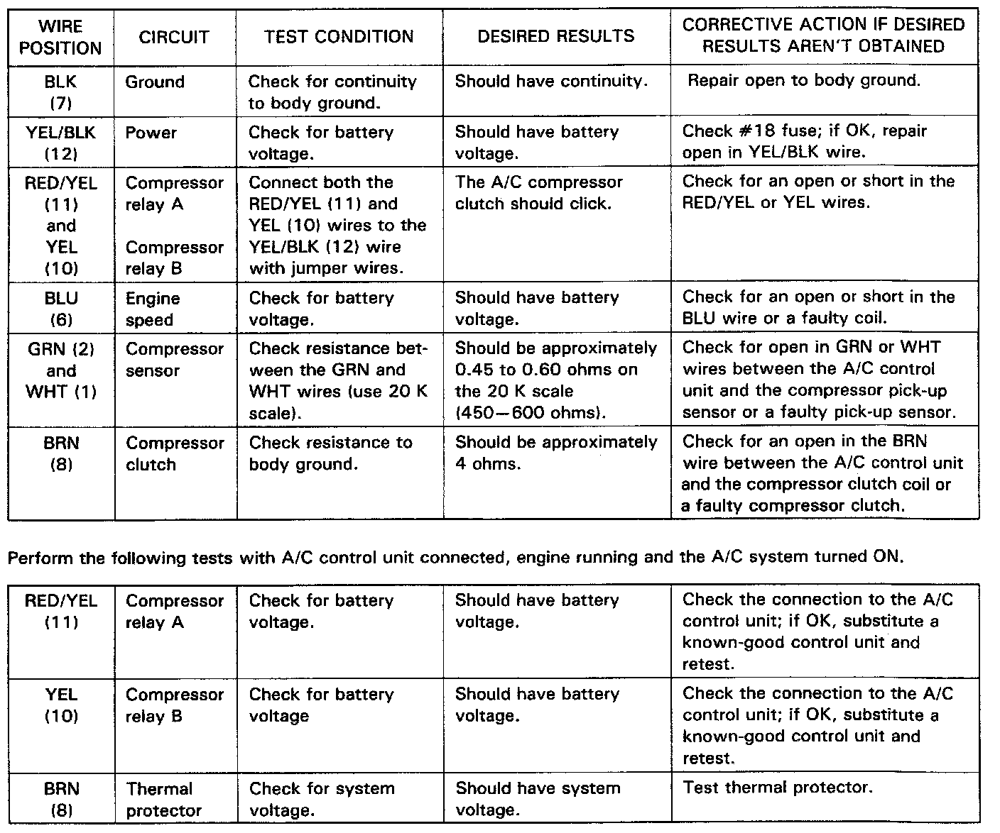 Perform the initial tests in the illustration below with the A/C control unit disconnected, and the ignition switch, blower switch, and A/C switch ON.