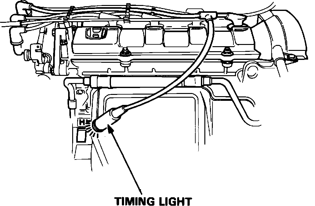 4. Connect a timing light to the engine. With the engine running at idle speed, point the timing light toward the pointer on the flywheel (manual trans.), or on the drive plate (auto. trans.).