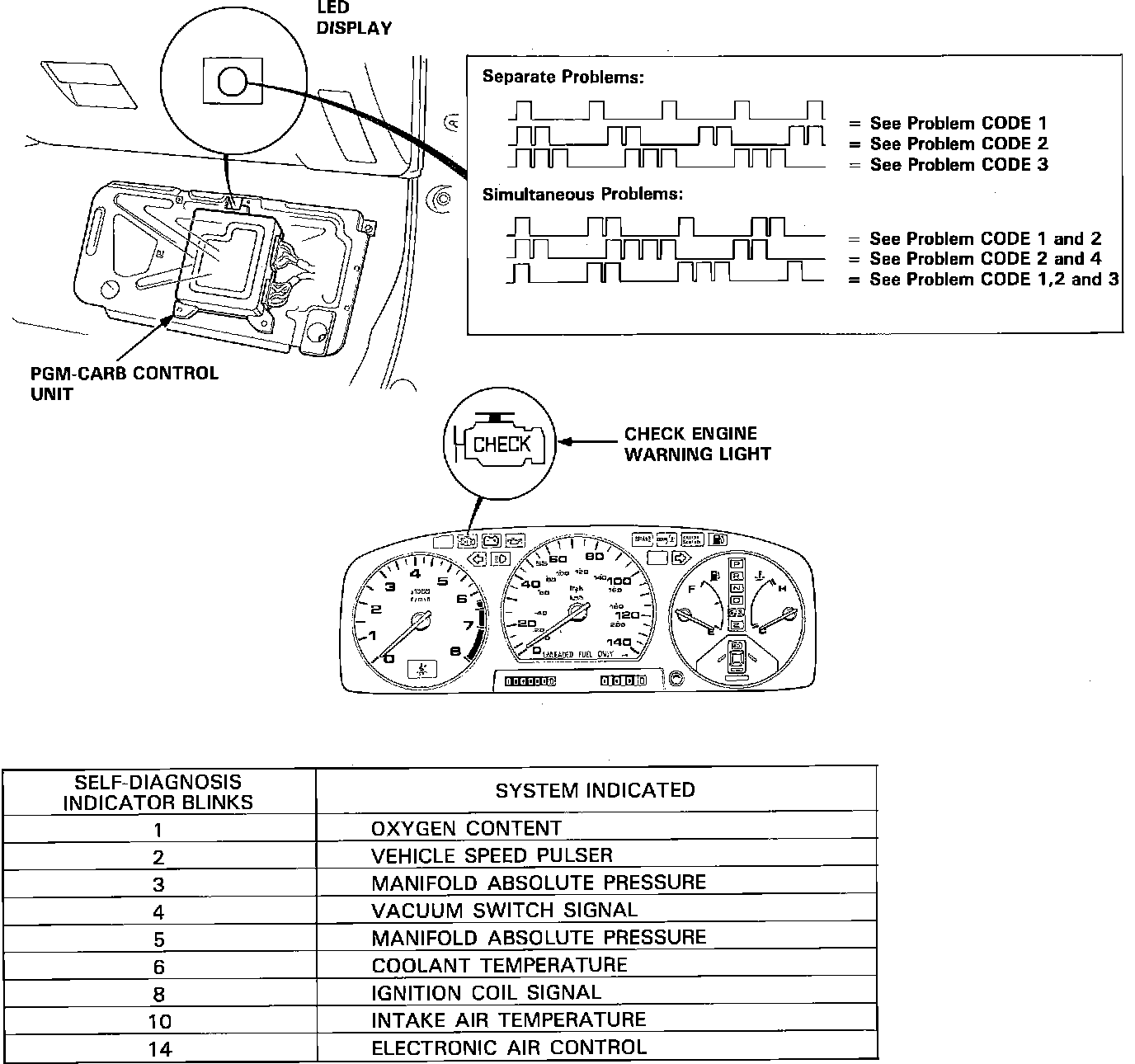 When it has been reported that the "CHECK ENGINE" light has come on, turn the ignition ON, pull down the passenger's side carpet inspection flap from under the dashboardand observe the LED on the top of the ECU. The LED indicates a system failure code by its blinking. This code can help to locate and repair failed components in the fuel injection or emission control systems.