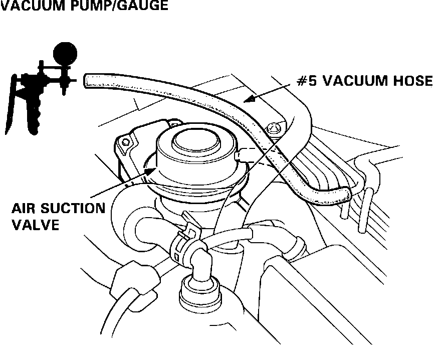 7. If the 'bubbling' noise is not heard, disconnect the #5 vacuum hose from the air suction valve and connect it to a vacuum gauge. When decelerating from a speed greater than 12.5 mph, vacuum should be available.