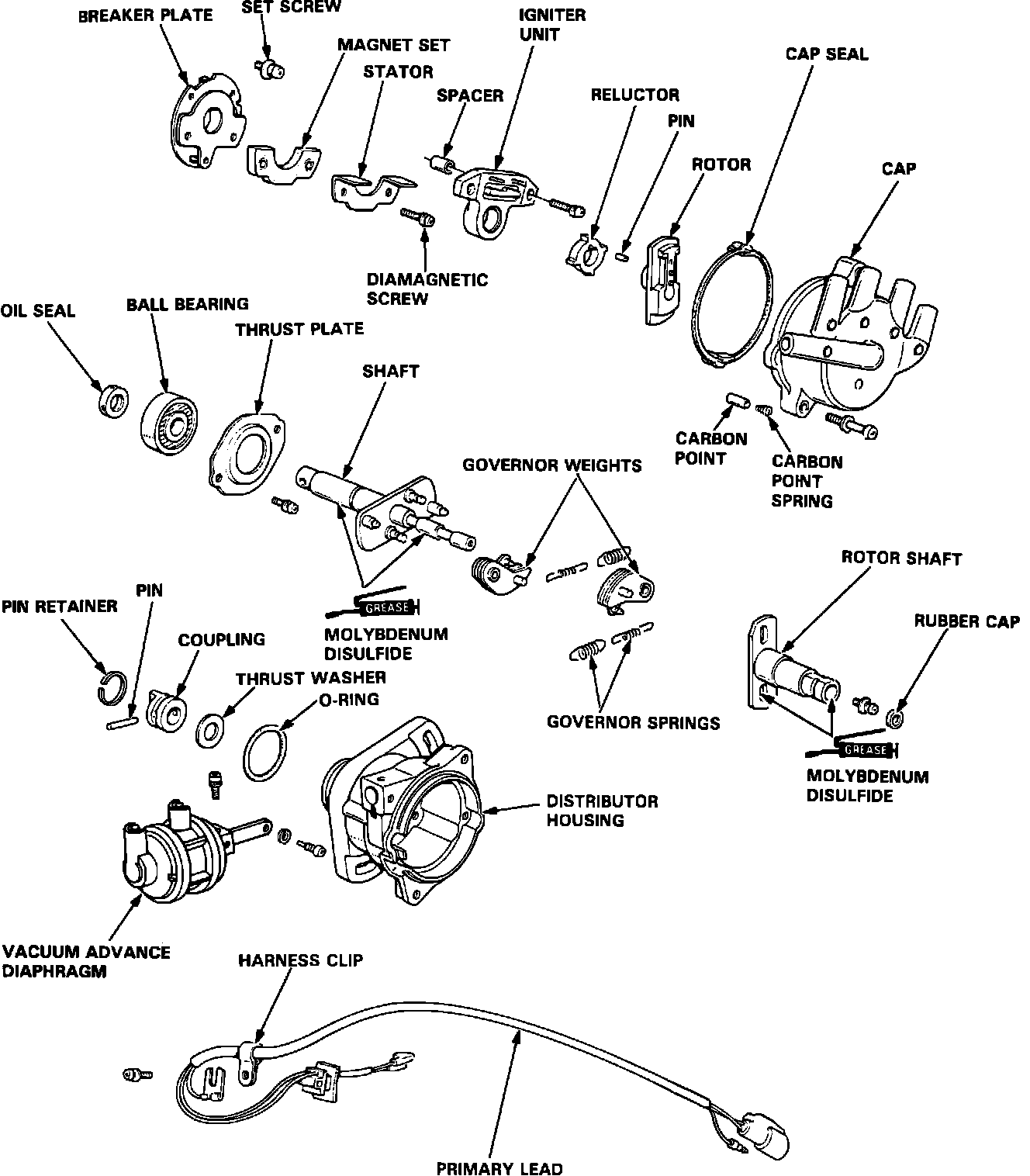 Battery voltage is supplied to the positive side of the ignition coil by the ignition switch. As the reluctor inside the distributor rotates it collapses a magnetic field surrounding the stator. The collapse of this field produces a voltage pulse in the stator windings within the igniter unit. The pulse is transmitted to the power switching transistor also located inside the igniter unit. The pulse of the power switching transistor interrupts current flow through the primary circuit. This interruption induces high voltage in the secondary coil. The high voltage travels through the coil wire to the distributor cap where it is transferred, by the distributor rotor, to the specified secondary ignition wire. Finally the high voltage reaches a spark plug where it jumps a specified gap and ignites the air/fuel mixture within the combustion chamber. The stator and igniter/pick-up coil assembly are located inside the distributor. The distributor also utilizes centrifugal and vacuum advance controls for maximum engine performance at all operating temperatures and speeds.