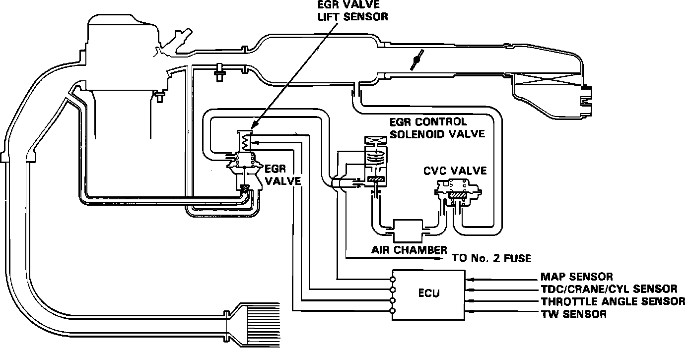 The EGR Valve Lift Sensor, located on top of the EGR valve itself, is a linear potentiometer type of sensor. This signal is used by the ECU to determine the amount of EGR valve lift, which is then compared to a table of ideal valve lift based on the current operating conditions. The ECU uses this information to vary actual valve lift to match the ideal valve lift for all operating conditions.