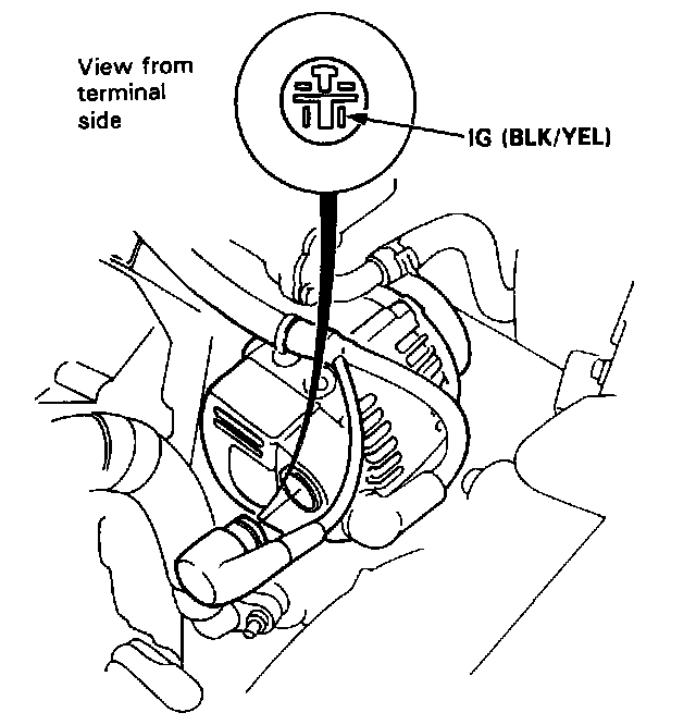 With the ignition switch on, there should be battery voltage between the IG (BLK/YEL) terminal and body ground.