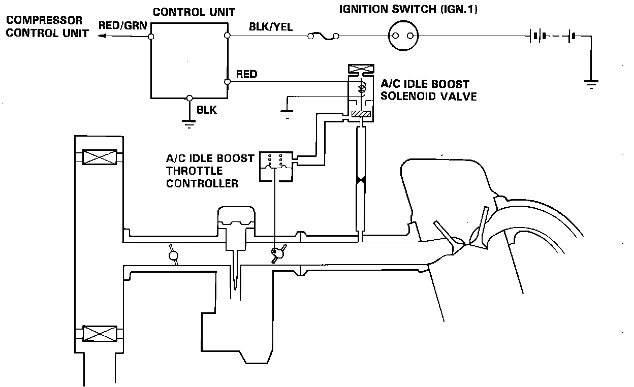 The A/C Idle Boost Solenoid Valve, mounted on the right side of the firewall, is used by the PGM-Carb unit to control idle speed. When the compressor is activated, the PGM-Carb unit sends current to the A/C Idle Boost Solenoid Valve. As the valve opens, manifold vacuum is passed through to the diaphragm chamber of the idle boost controller. The idle controllers diaphragm rod is retracted to open the throttle valve a certain amount.