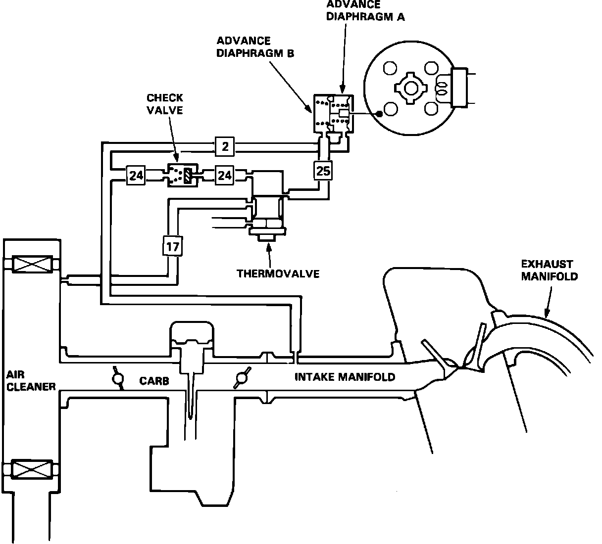 During cold engine start, manifold vacuum is supplied to vacuum advance diaphragm A, through a check valve, and the thermovalve. When engine coolant temperature reaches 140°F (60°C) the thermovalve releases vacuum from diaphragm A by opening a passage to atmospheric vent located on the air cleaner.