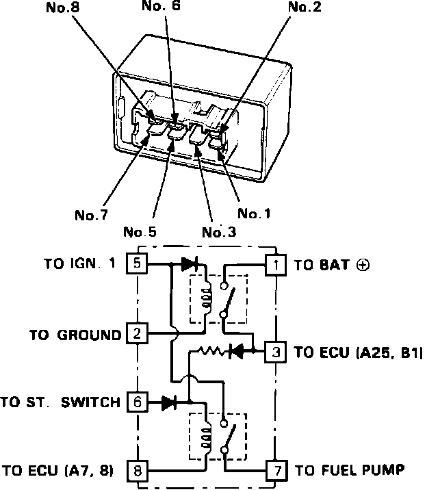 2. Attach the positive battery terminal to the #6 terminal and the negative battery terminal to the #8 terminal of the main relay. Then check for continuity between the #5 terminal and the #7 terminal of the main relay.