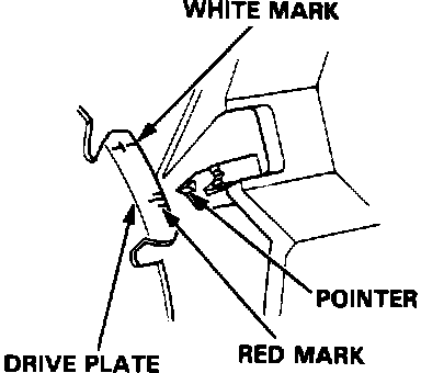 4. Connect a timing light to the No. 1 ignition wire; while the engine idles, point the light toward the pointer on the flywheel (for M/T), or on the drive plate (for A/T).