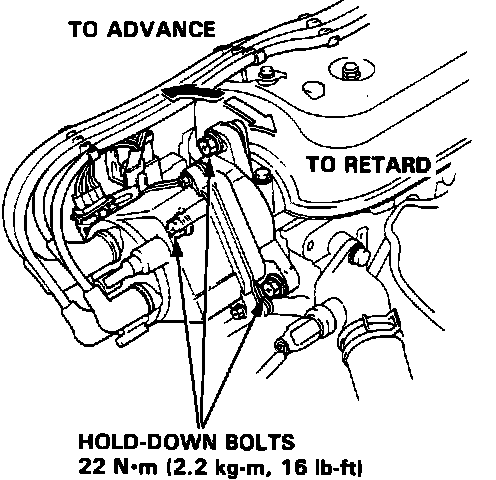 6. Adjust as necessary by loosening the distributor adjusting bolts, and turn the distributor housing counterclockwise to advance the timing or clockwise to retard timing.