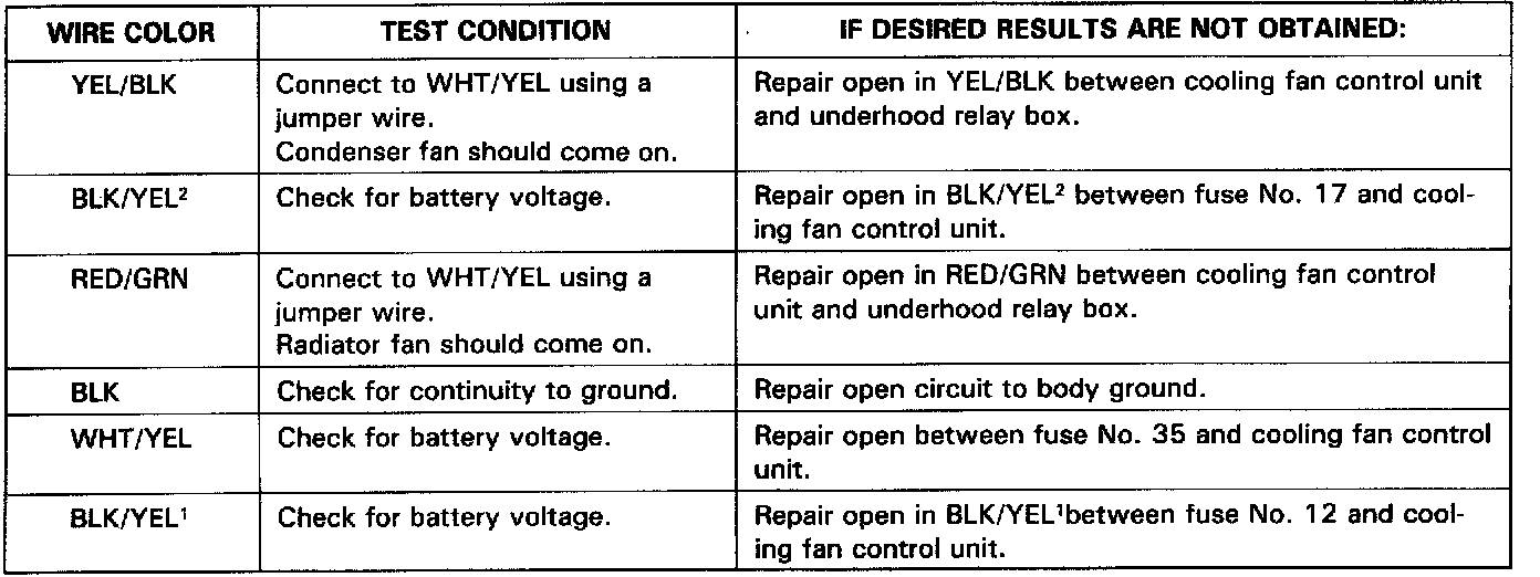 NOTE: If all tests check OK, replace with know good cooling fan control unit.