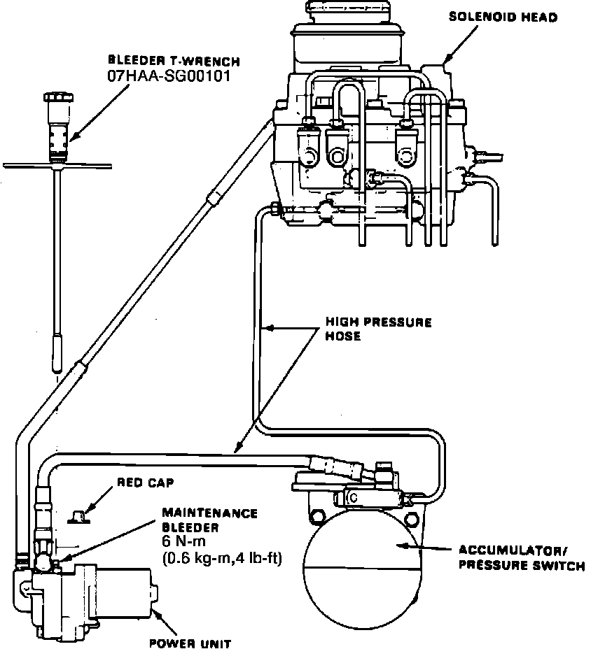 2. Fill modulator reservoir to max level, then bleed high pressure fluid from maintenance bleeder with special bleeder wrench tool No. 07HAA-SG00101 or equivalent, Fig. 8.