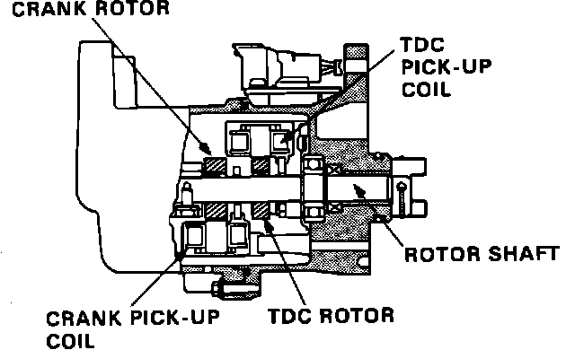 The TDC/CRANK sensor, found inside of the distributor housing, consists of the TDC sensor rotor, CRANK sensor rotor, their associated pick-up coils, and a common shaft that is directly coupled to the camshaft. Because the shaft is coupled to the camshaft both sensors turn in time with the engine. As the teeth on the sensors break the flux lines of their respective pick-up coils a voltage pulse is generated. These pulses are the input signal to the ECU.