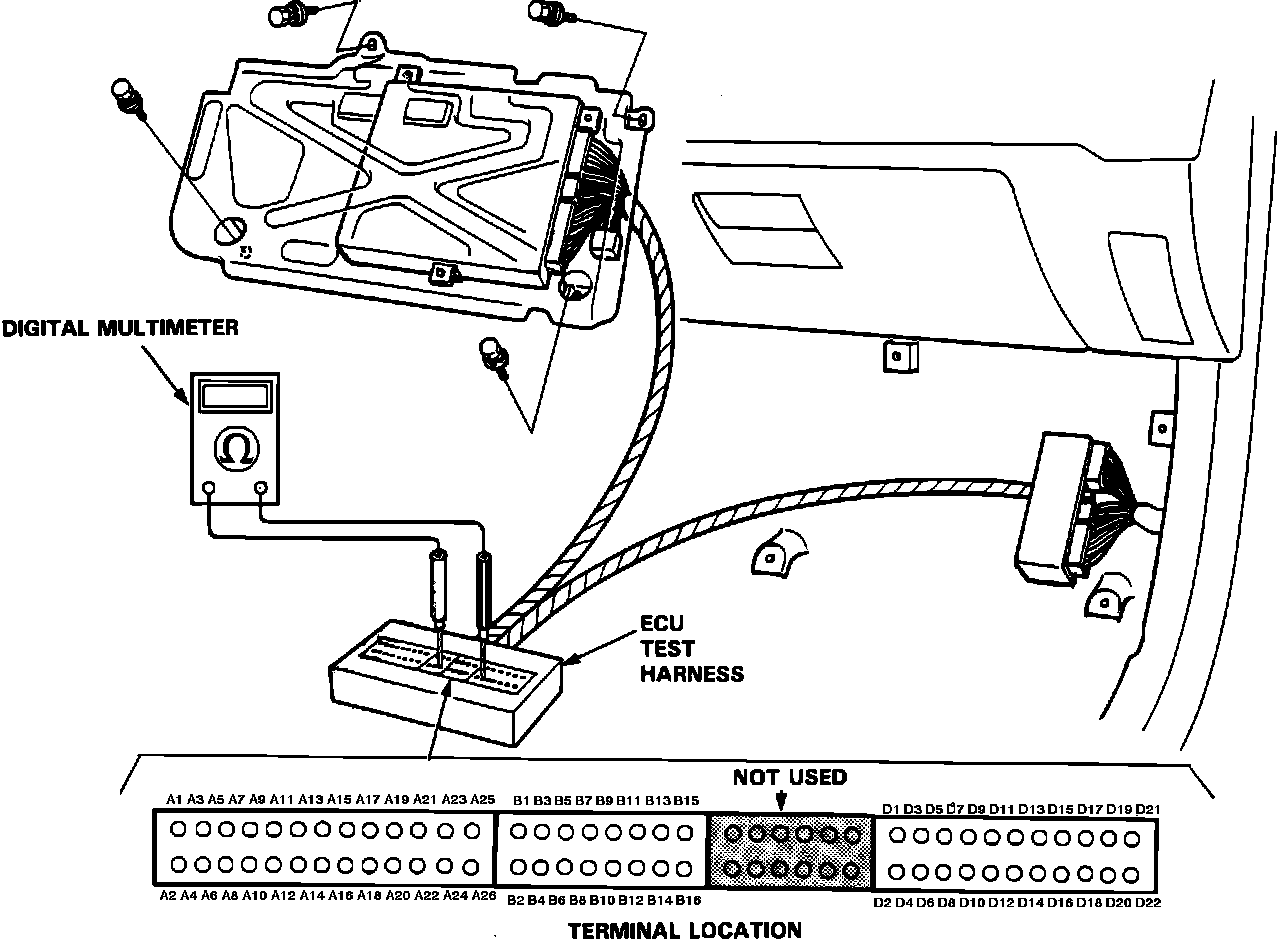 If the inspection for a particular failure code requires the ECU test harness, remove the right door sill molding, the small cover on the right kick panel, and pull the carpet back to expose the ECU. Unbolt the ECU bracket. Connect the ECU test harness. Then check the system according to the procedure described for the appropriate code(s) listed. The purpose of the ECU test harness is to allow circuit testing without having to back-probe the ECU harness. If the ECU test harness is unavailable, CAREFUL back probing of the ECU harness will have to be performed.