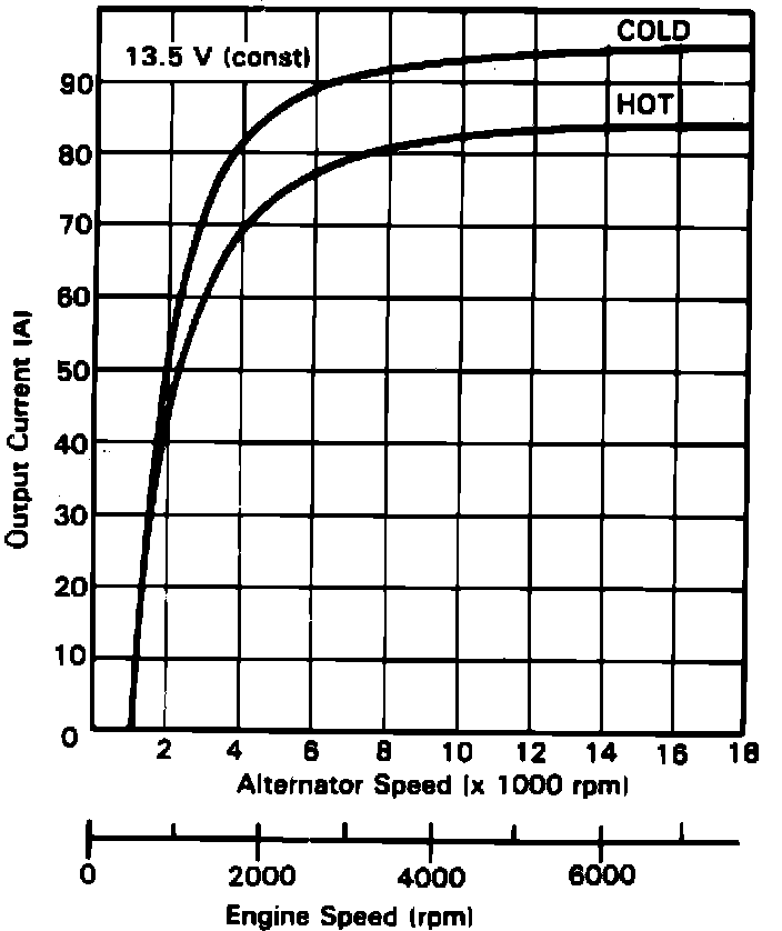 a. When checking alternator output, operate engine at 2000 RPM with engine cooling fan off. Apply a load to charging system so that voltage drops to no lower than 12 volts. Tester readings should be within 10 amps of readings indicated in Figs. 5 through 7. If readings are within specification, charging system is operating properly, refer to CHARGE WARNING LAMP TEST. If readings are not within specification, proceed to step b.