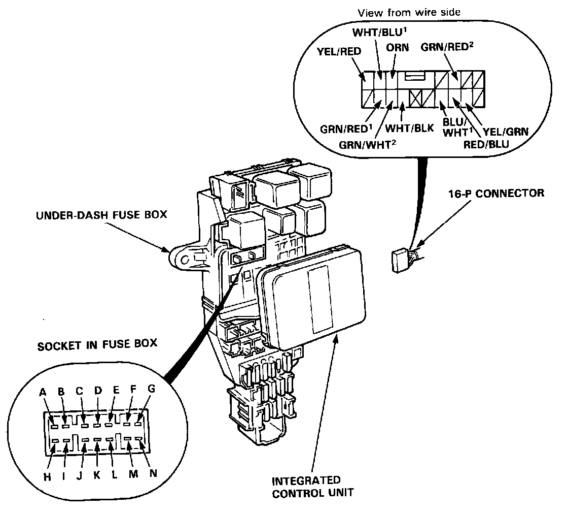 Remove the left side kick panel cover, then disconnect the 16-P connector from the integrated control unit. Remove the intergrated control unit from the under-dash fuse box.