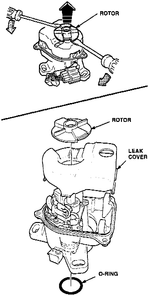 5. Remove the distributor cap. Remove the rotor by prying it up with two screwdrivers as shown below. Remove the leak cover. Remove the distributor-to-cylinder head O-ring. Do not discard the leak cover and rotor. They will be needed for reassembly.