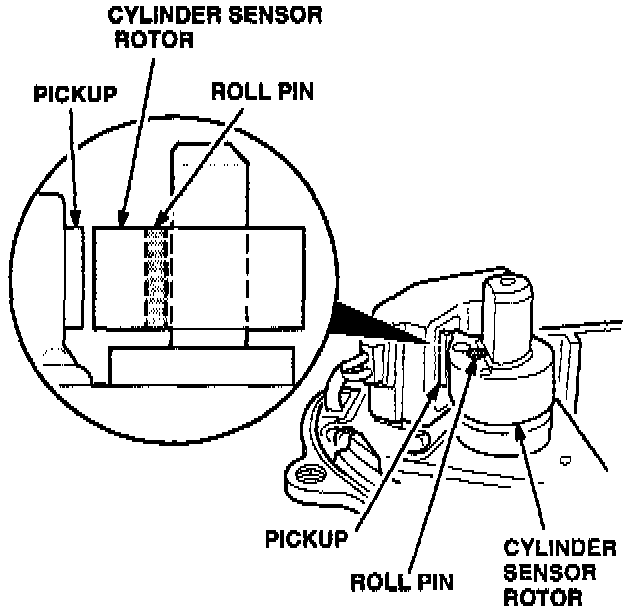 14. Install the cylinder sensor rotor on the shaft. Use a small punch to drive the new roll pin into the rotor. Verify that the rotor is lined up with the pick-up and that the roll pin is flush with the top of the rotor.
