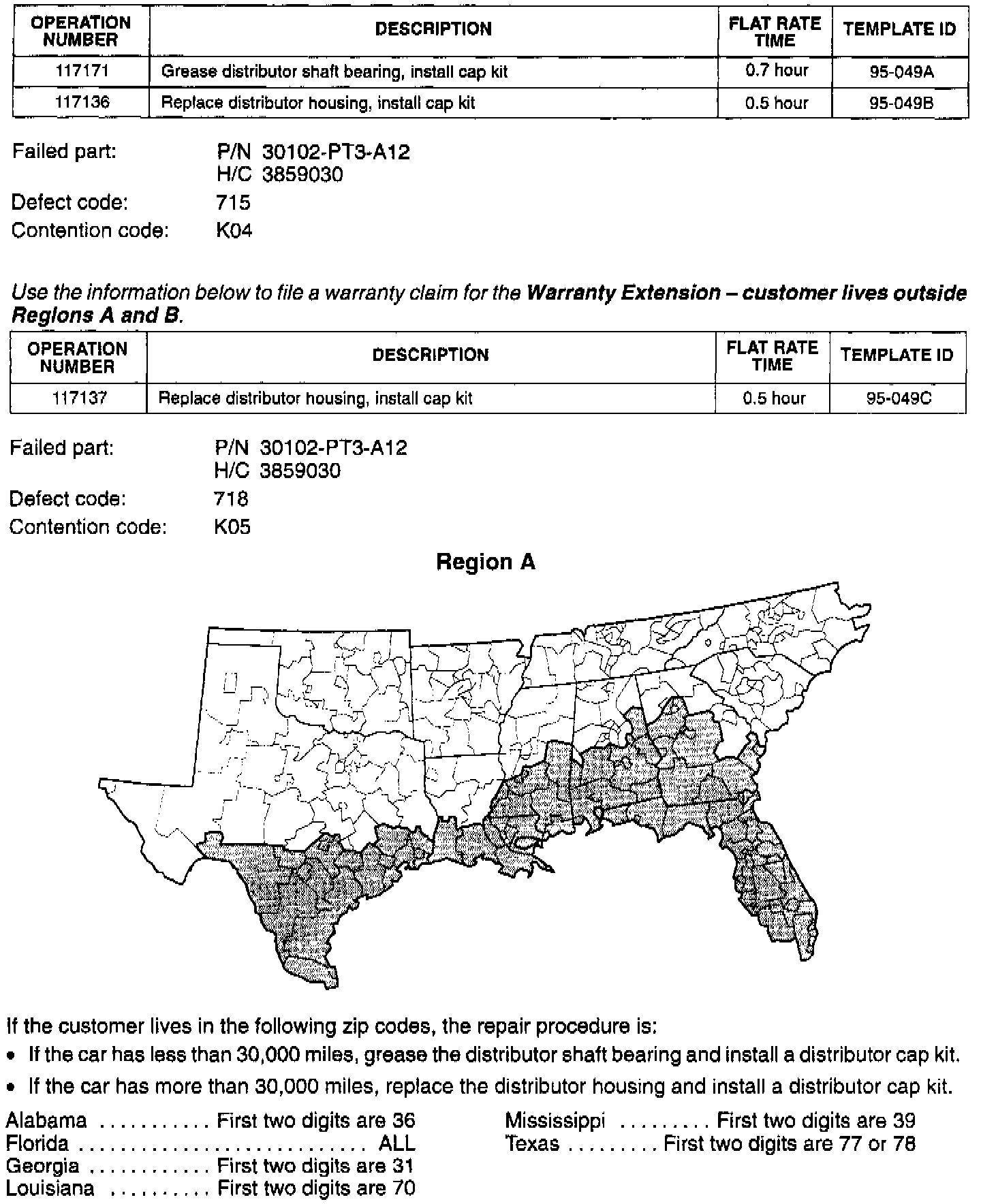Owners of affected vehicles in the rest of the U.S. will be sent a letter notifying them that the warranty on the distributor assembly has been extended to 6 years/75,000 miles.