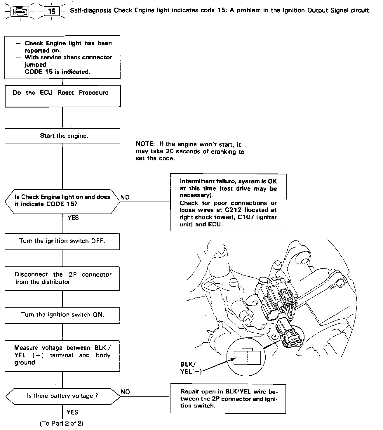 Check Engine Light indicates trouble code 15:Most likely a problem in the Ignition Output Signal Circuit.