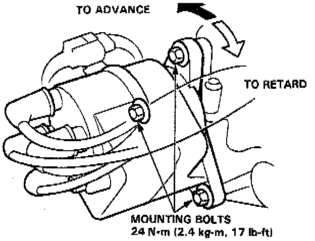 5. If it is necessary to adjust the ignition timing, loosen the distributor mounting bolts, and turn the distributor housing counterclockwise to advance the timing, or clockwise to retard the timing.