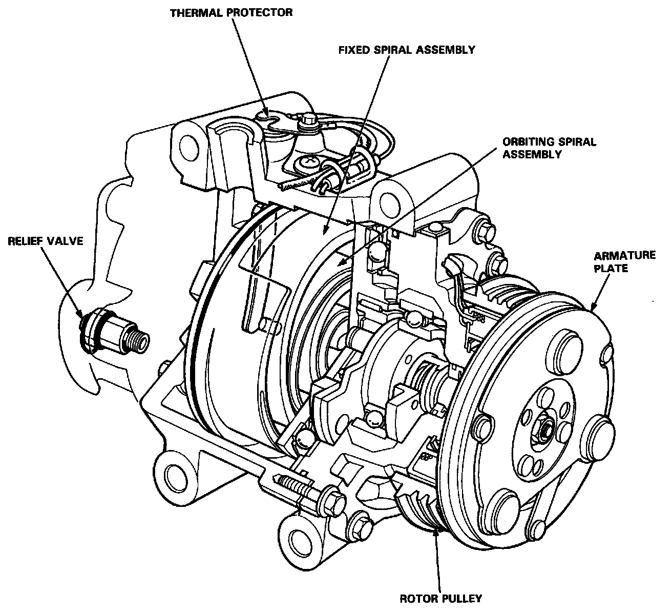 is compressed between a fixed spiral assembly and an orbiting spiral assembly. A thermal protector is installed on this compressor.
