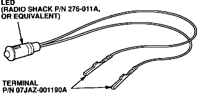 First, you need to make two 12V LED test lights. We used two Radio Shack LEDs (P/N 276-011A) with terminals (P/N 07JAZ-001190A) from our Automobile Terminal Pin Repair Kit. Label one test light "A" and the other "B."