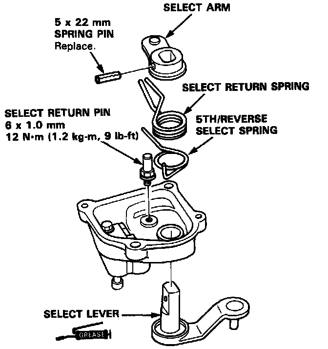 2. Remove the spring pin, then remove the select lever, select arm and springs.