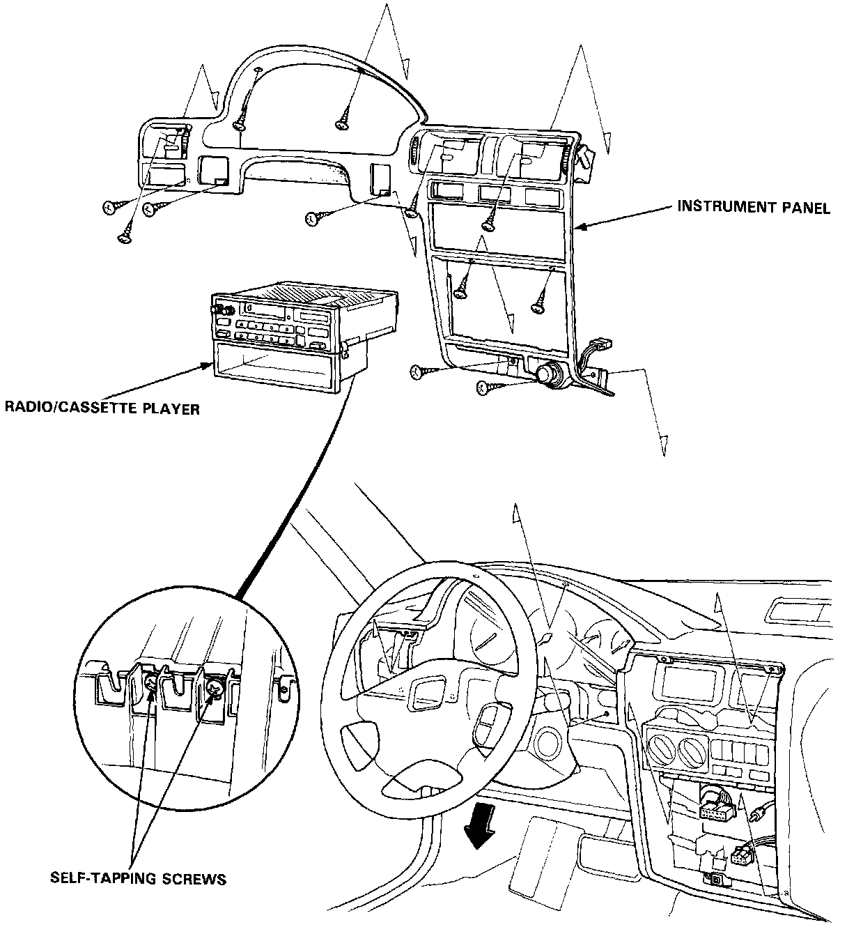 - Loosen the self-tapping screws under the radio/cassette player, and remove the radio/cassette player.
