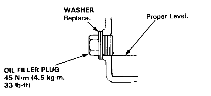 2. The oil level must be up to the fill hole. If it is below the hole, add oil until it runs out, then reinstall the oil filler plug with a new washer.