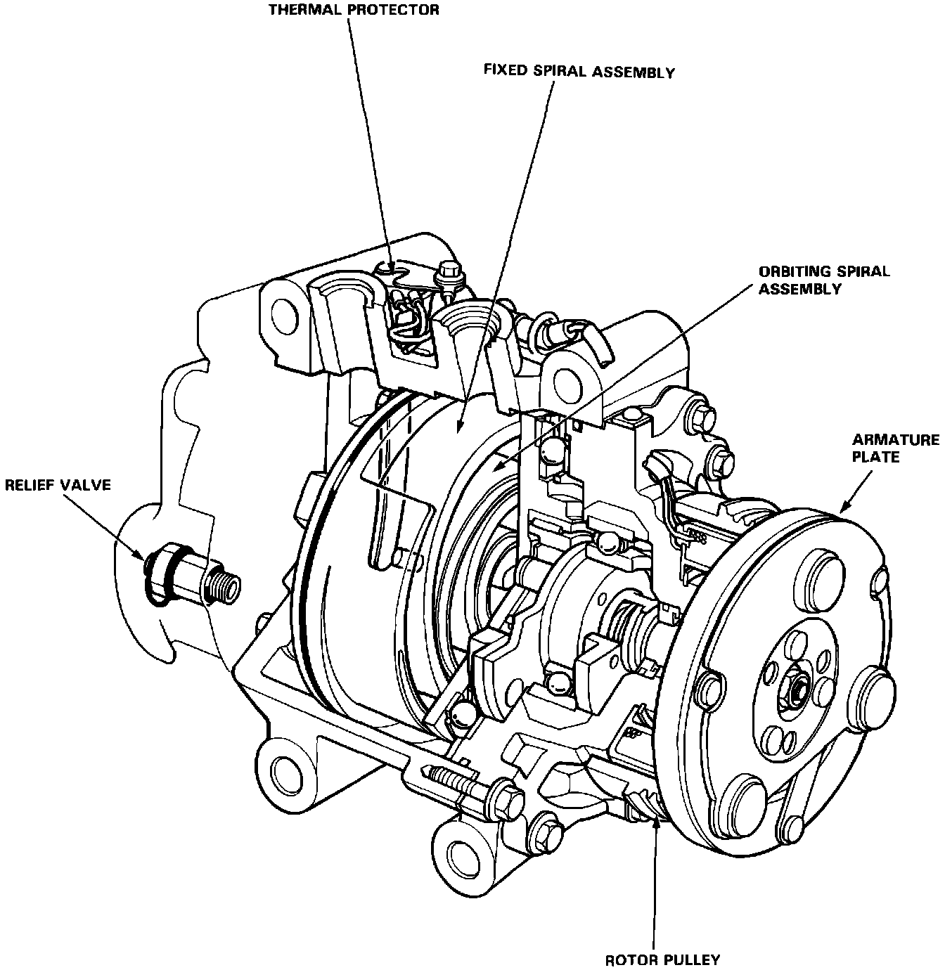 In this spiral type compressor, refrigerant is compressed between a fixed spiral assembly and an orbiting spiral assembly. A thermal protector is installed on this compressor in the event that the evaporator temperature gets too cold. If the evaporator temperature drops below 31°-35°F (-.5°-1.5°C), the compressor will be disabled until the evaporator temperature raises to within 36°-41°F (2.5°-5°C).
