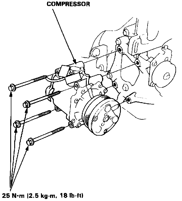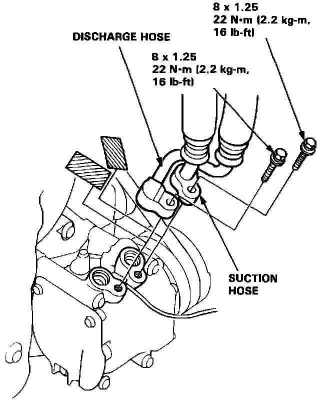 4. Remove the two bolts, and disconnect the suction hose and discharge hose from the compressor.