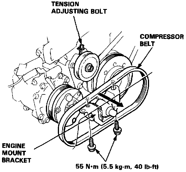 5. Loosen the compressor belt tension adjusting bolt, and remove the belt from the pulleys. Remove the two left engine mount bracket bolts, and pass the belt through the gap between the body and left engine mount bracket.