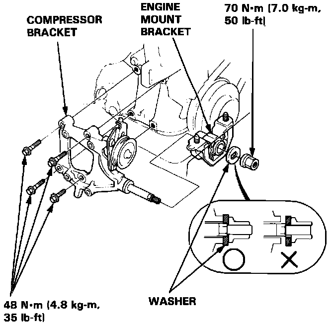 NOTE: When tightening left engine mount nut, make sure the washer is set properly on the engine mount bracket as shown.