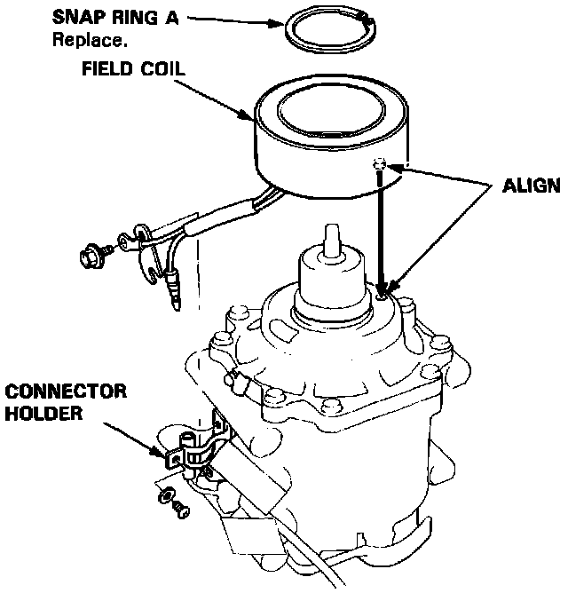 - When installing the field coil, align the boss on the field coil with the hole in the compressor.