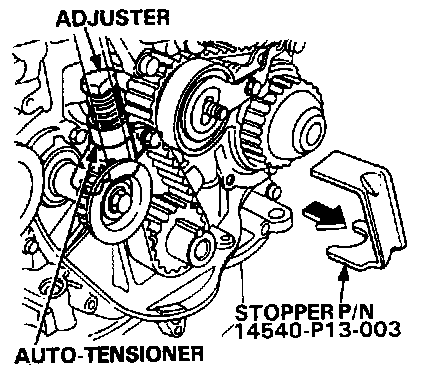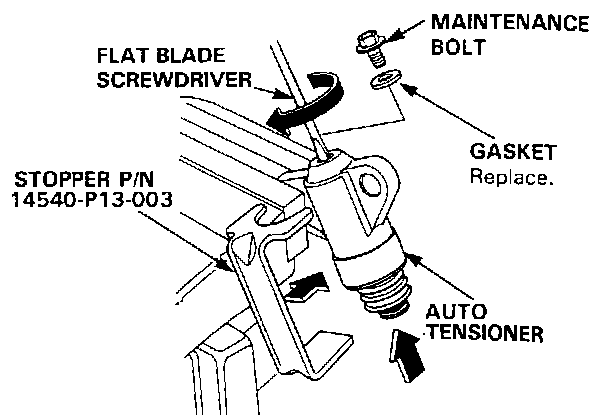 20. Insert a flat blade screwdriver into the maintenance hole. Place the stopper (P/N 14540-P13-003( on the auto tensioner while turning the screwdriver clockwise to compress the bottom.